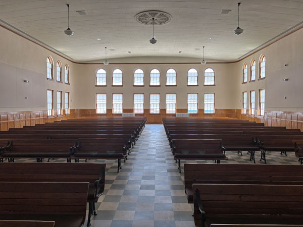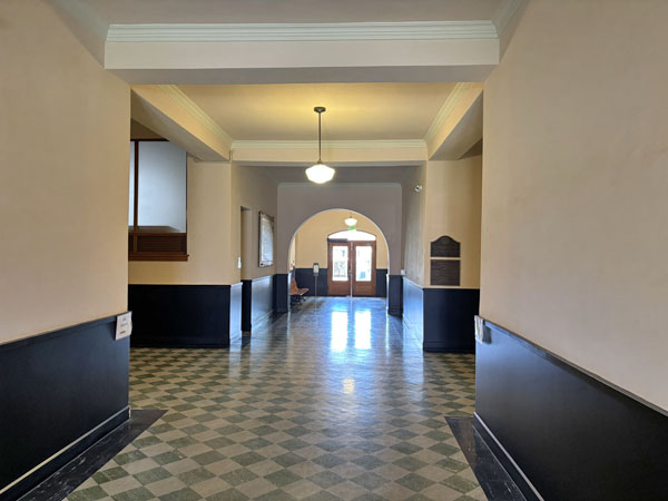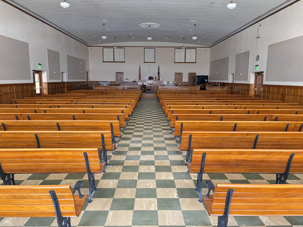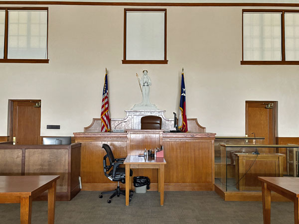 Look back at the empty courtroom with natural light