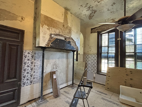 Original 1893 stove & vent hood removed to make repairs