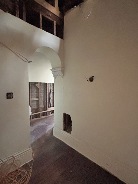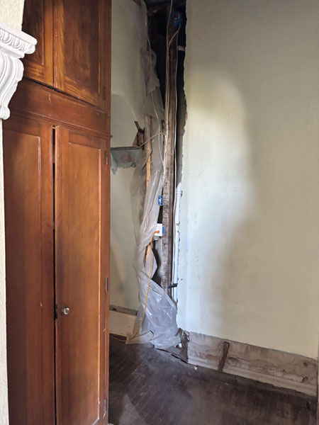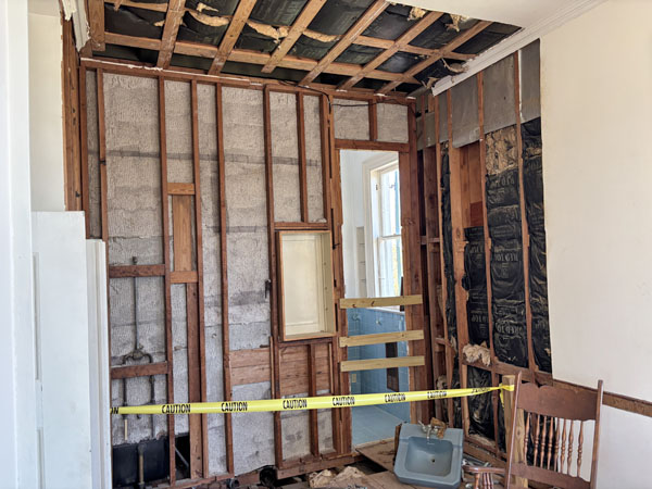 Wall to the added blue bathroom cleared out for access to plumbing