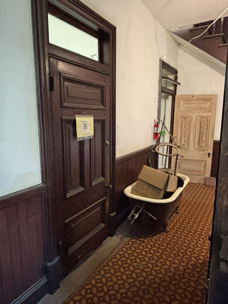 The tub is out in the hallway as we exit and walk to the main stairway
