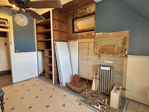 Original 1920 shower with heat vents, right, & cabinet for heating towels