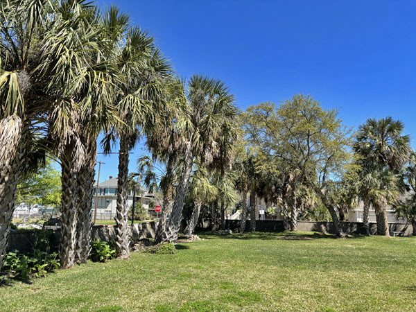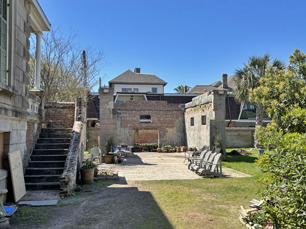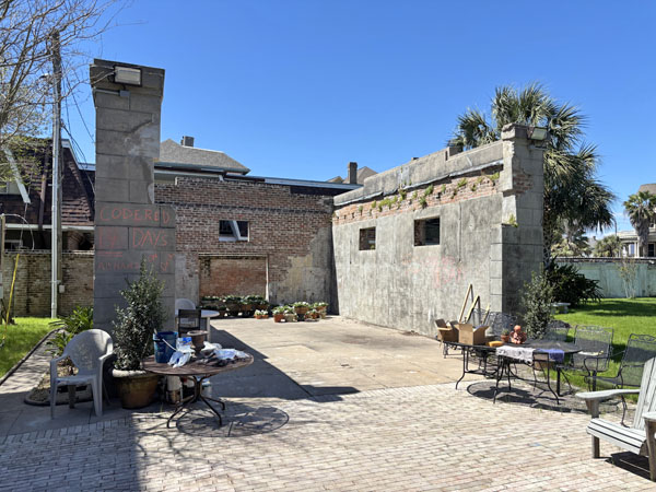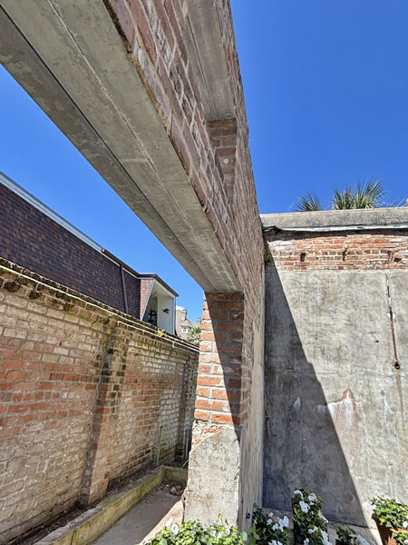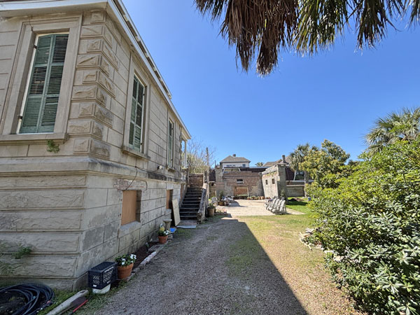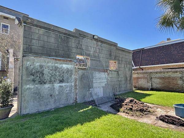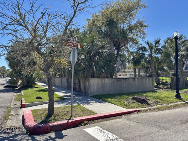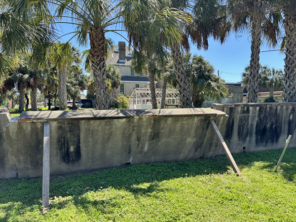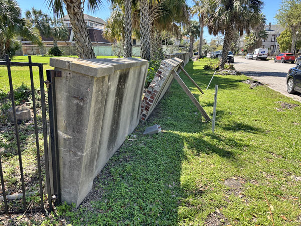Exit the back yard and see the falling brick fence along Sealy Avenue