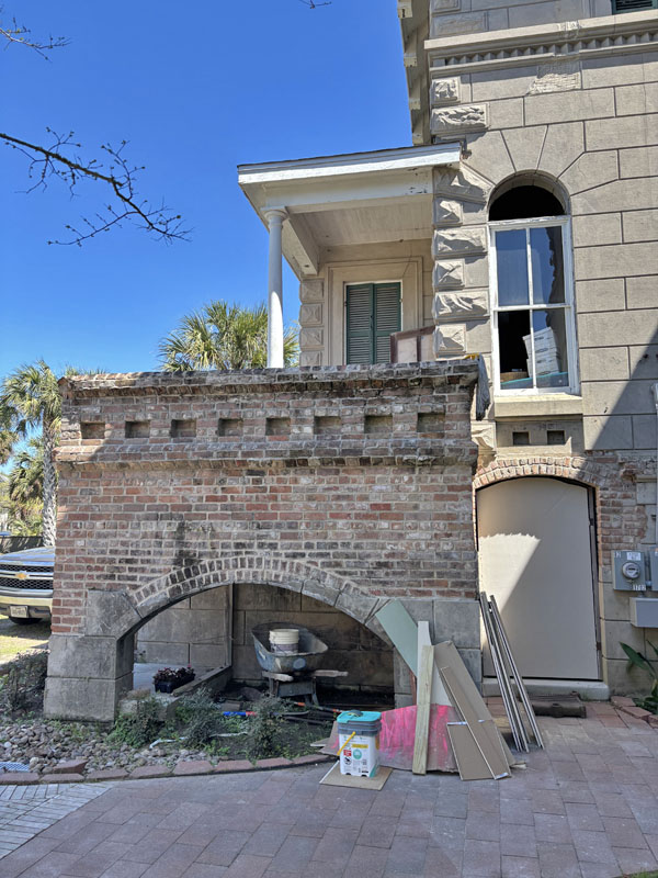 Fake paneling over brick removed to repair failing mortar