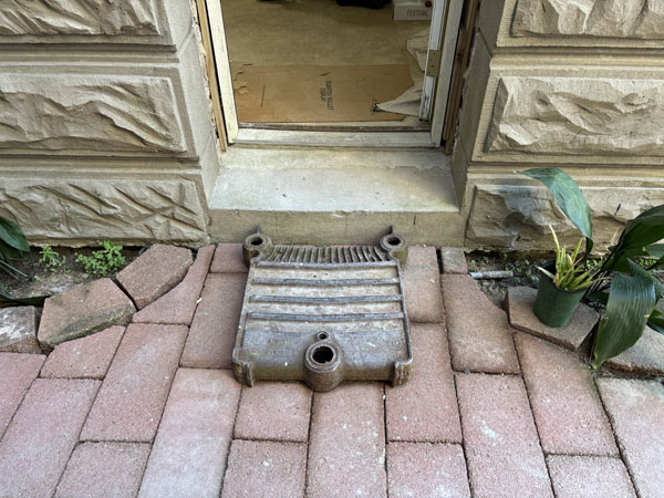 Workroom below 1920 added Sunroom has radiator panel as floormat