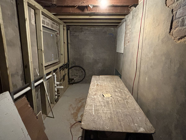 Enter basement workroom w/new copper roof drain emptying on left