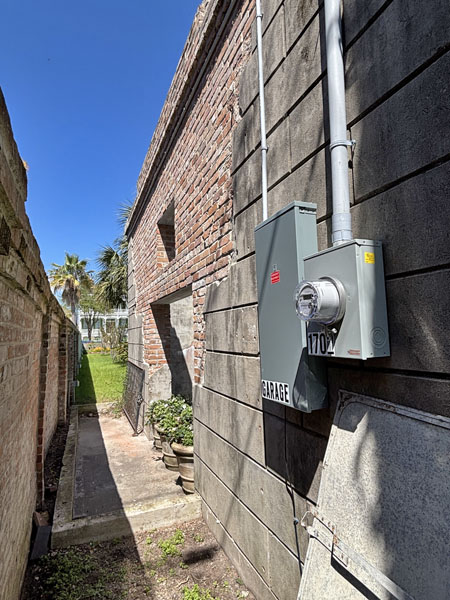 Garage electrical box behind garage w/veneer removed & masonry repaired