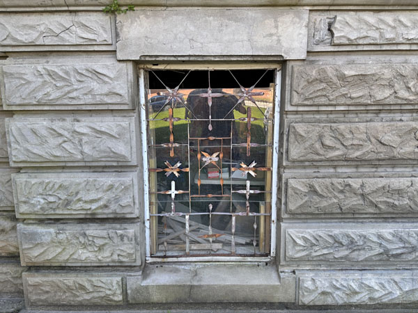 Painted plywood covers windows w/stained glass safely stored for now