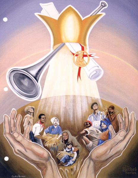 | Lesson 15 and its symbolism: People - The church is a people Uplifting hands - It is a people that is born, nurtured, and sustained by God. Scroll in Crown - It is a people that shares a continuity in mission and purpose with the ancient Abrahamic community. Servant seal on scroll and clothing - It is a servant people that models its lifestyle after Jesus, its Lord. Crown - It is a people that takes its directives from Christ, its head. Ray of Light - It is a recipient people with a motive for mission. Trumpet - It is the proclaiming agency of God's purpose and will. Silhouetted sphere - It is a people walking in the light of Christ's resurrection and looking ahead to a second world. Ethnic Mixture of many peoples - It is a reconciliatory instrument in the hands of God, ordained by him to gather the scattered and the separated people of his earth and to make them one in his saving Christ. Cross on scroll - As the members of "Christ's body," it is a people that has been called by him to be a redemptive agency in the world in which it lives. |