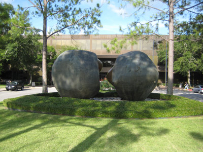 ![]() Renowned Spanish sculptor, Pablo Serrano, created "Spiritus Mundi", translated to "Spirit of the World." Serrano's concept is described as "the juxtaposition and tension within each pairing of life." The two bronze objects are arranged in an adversarial pose. Each object has a polished side and a dark-patina side with handprints. The two halves represent something separated, yet is part of itself. | |
