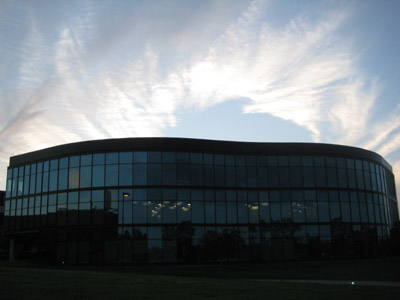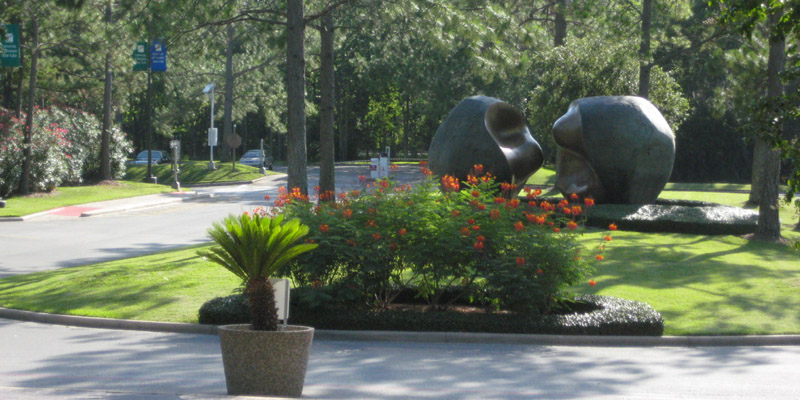 ![]() Beyond the sculpture, UHCL's main building, the Bayou Building, opened for classes in 1974 | |