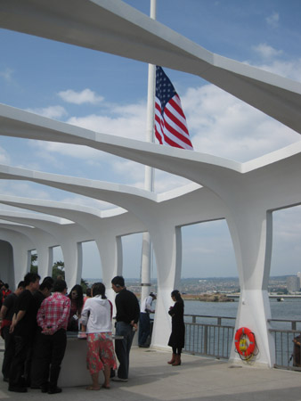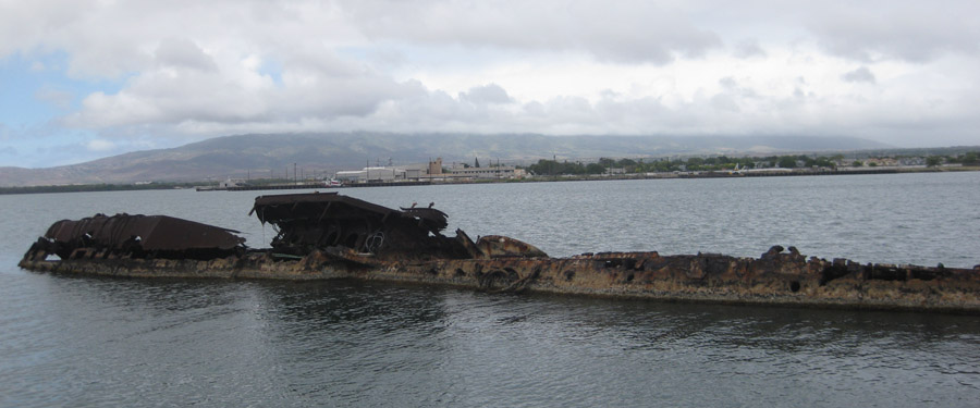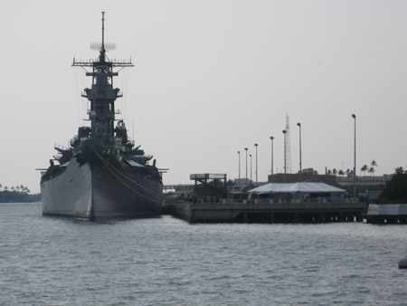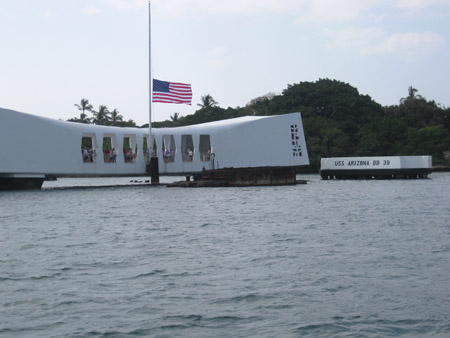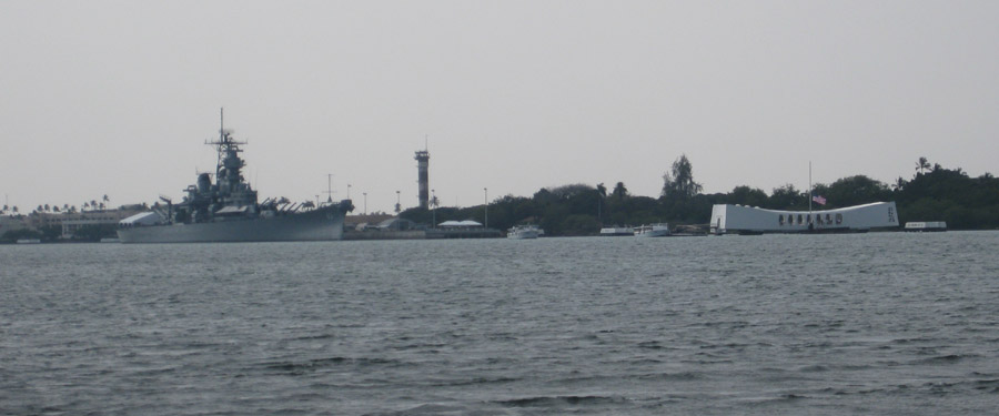 ![]() USS Missouri (BB-63), representing the end of WWII, faces the USS Arizona (BB-39) Memorial, the start of WWII | ||
