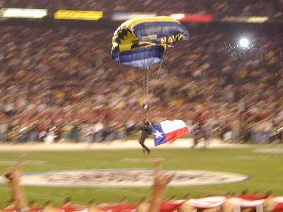 ![]() A Texan paratrooper displays which side he roots for |