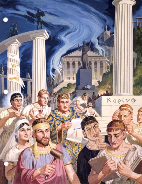 | Lesson 14 and its symbolism: Structures in background - The City of Corinth. Blue vapors and ominous sky - Idolatry, immorality, and paganism of the vilest nature characterized this ancient Greek city. Group of People (forefront) - In the midst of this pagan and materialistic culture lived a band of believers called the Corinthian church. Paul, through two letters, encourages the fellowship at Corinth to demonstrate by attitude and act the highest Christian virtues. Column on right - The first letter to the church at Corinth.